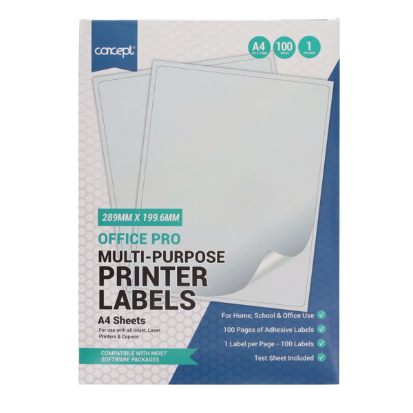 CONCEPT A4 MULTI-PURPOSE PRINTER LABELS 100 SHEETS – 1 LABEL