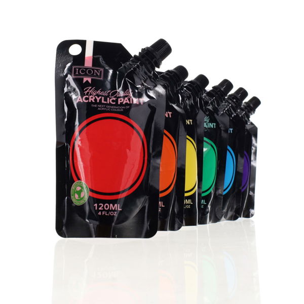 Premium fine acrylic uniquely packaged in a revolutionary flexible pouch Airless pouch prevents paint drying out Richly pigmented free flowing colour Non toxic