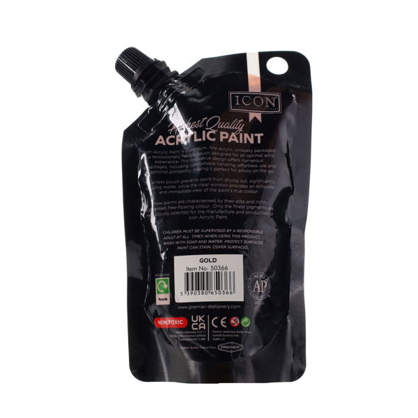 Premium fine acrylic uniquely packaged in a revolutionary flexible pouch Airless pouch prevents paint drying out Richly pigmented free flowing colour Non toxic