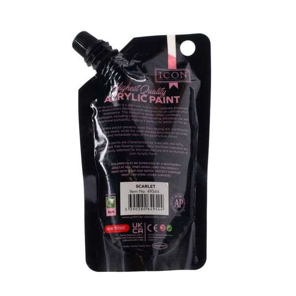Premium fine acrylic uniquely packaged in a revolutionary flexible pouch Airless pouch prevents paint drying out Richly pigmented free flowing colour Non toxic
