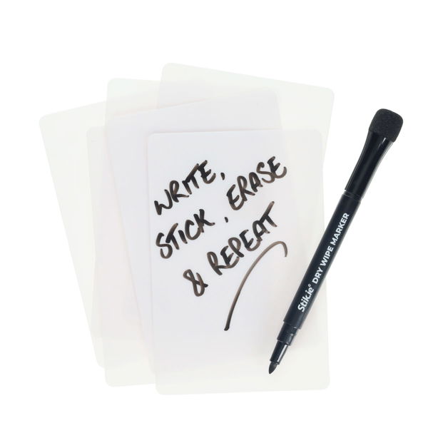 Write & erase up to 2000 times per stikie note Simply wipe with a damp cloth to remove ink & wipe dry to reuse Stain-free & erasable Clings to metal grips to glass & sticks to plastic Includes dry wipe marker